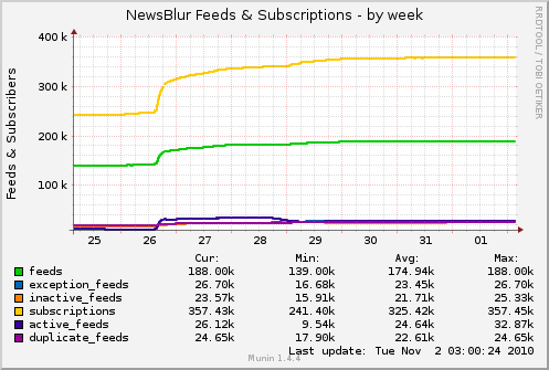 I also have a whole suite of custom graphs to watch how many intelligence classifiers users are making, how many feeds and subscriptions users are adding, the rate of new users, premium users, old users returning, new users sticking around, and load times of feeds (rolling max, min, and average).